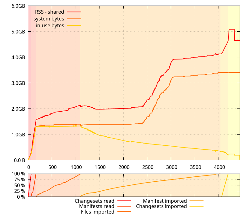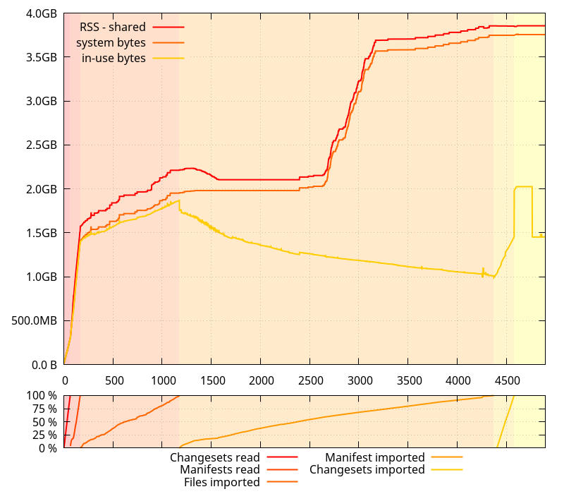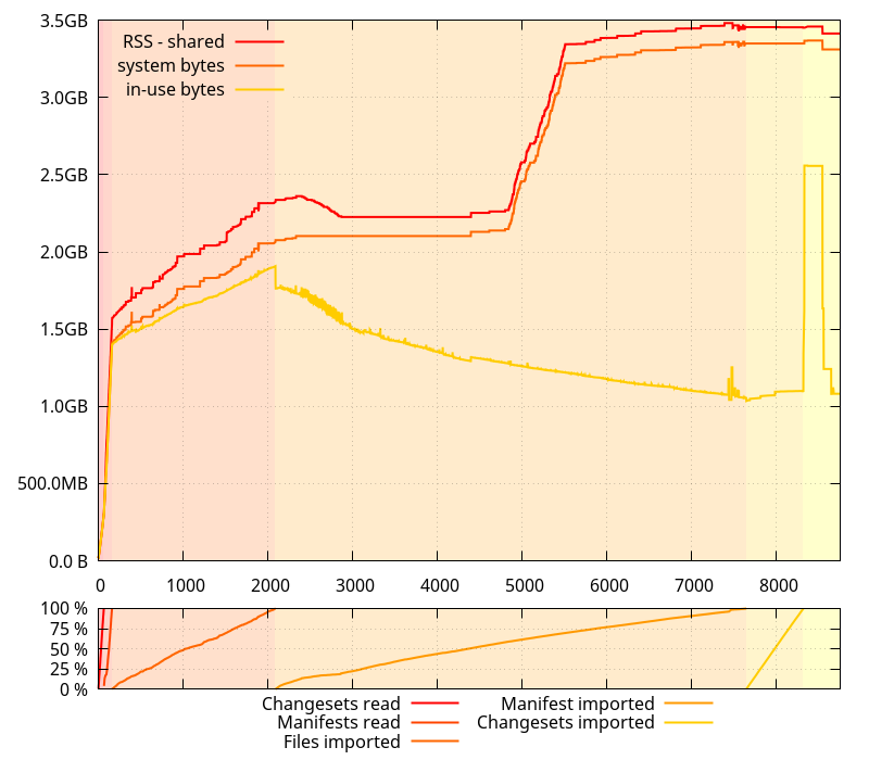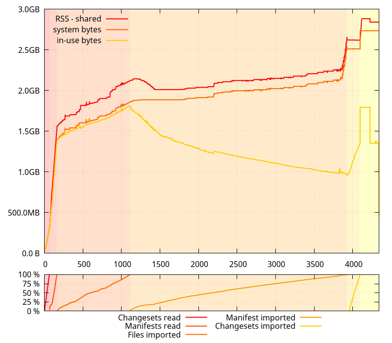 - Actual memory use is going down during the "Import manifests" phase, contrary to what the evolution of RSS suggests.