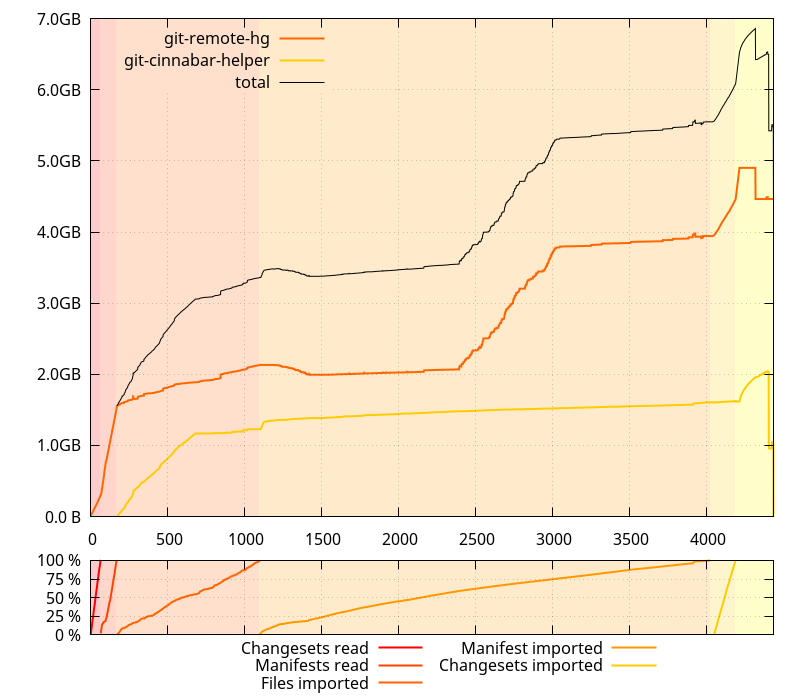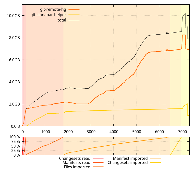 Less time spent, less memory usage... ok. There's definitely something wrong on master. But wait a minute, that slope from ~2GB to ~4GB on the git-remote-hg process doesn't actually make any kind of sense. I mean, I'd understand it if it were starting and finishing with the "Import manifest" phase, but it starts in the middle of it, and ends long before it finishes. WTH?